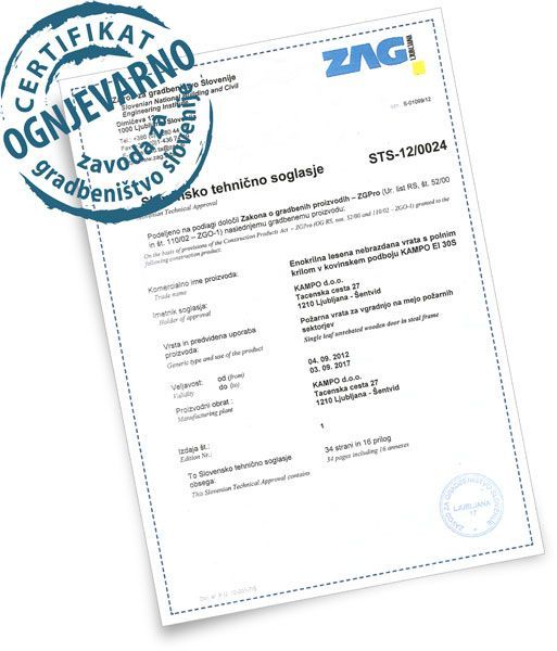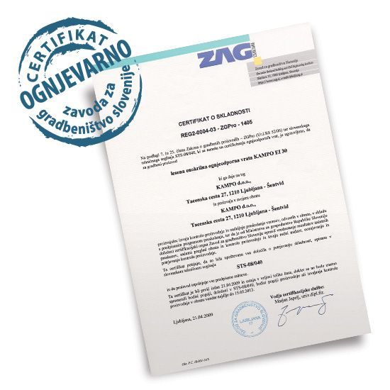 Požarno odporna vrata Kampo EI30 so namenjena za vgradnjo na mejo požarnih sektorjev. So plod nekajletnega razvoja, ki smo se mu posvetili v podjetju Kampo, ker smo želeli zahtevnejšim naročnikom zagotoviti izvedbo lesenih požarno odpornih vrat izven-serijskih dimenzij ter požarno odpornih vrat z bočno zasteklitvijo. Vratno krilo in podboj požarno odpornih vrat KAMPO EI30 sta lesena, finalna obloga krila in podboja je lahko obdelana z različnimi furnirji, laminati ali polnimi barvami in je lahko usklajena z ostalo opremo ali drugimi notranjimi vrati, ki nimajo zahteve po požarni odpornosti.